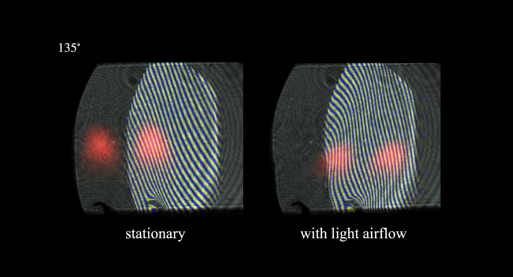 When the candle flame was gently perturbed by a light airflow, the interference patterns changed and became wavier (see images). These changes indicate local variations in the flame’s refractive index, which correspond to differences in density within the flame.